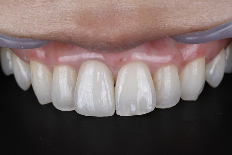 そして、炎症のない歯肉にするための歯周病治療も不可欠です。この患者様の場合、患歯の形態だけではなく、患歯の周りの黒ずんだ歯肉の色味や他の歯の色も気にされていたので、ガムピーリングとホワイトニングを提案し行いました。